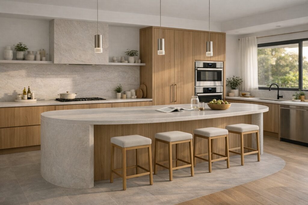 This kind of setup can take many forms. In some kitchens, it simply means an island with an overhang for stools. In others, it means a kitchen island with built in bench seating. Some homeowners also prefer a curved kitchen island for a softer, more custom look. The best option depends on your layout, how you use the kitchen, and the style you want to create.